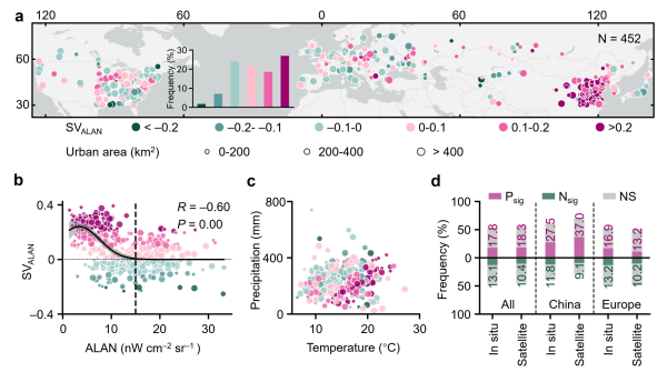 研究整合了2001-2022年間北半球452個中高緯度城市的62,994條站點實地觀測記錄與衛(wèi)星遙感數(shù)據(jù),系統(tǒng)分析了夜間人造光對城市植被秋季葉片衰老日期的影響。結(jié)果表明,在快速城市化背景下,夜間人造光水平的持續(xù)升高顯著推遲了城市植被葉片衰老日期。該延遲效應(yīng)在空間上呈現(xiàn)明顯異質(zhì)性,并表現(xiàn)出顯著的非線性特征,即在較低光強水平下效應(yīng)最為顯著,而在較高光強條件下逐漸減弱或趨于飽和。進一步分析表明,區(qū)域尺度上夜間人造光影響差異主要受城市社會經(jīng)濟因素和植被功能性狀的共同調(diào)控。從機制層面看,夜間人造光誘導(dǎo)的葉片衰老推遲可能與植被碳同化能力增強以及其對氣候因子響應(yīng)方式的改變密切相關(guān)。此外,研究通過在物候模型中引入夜間人造光因子改進了模型表現(xiàn),并預(yù)測整體上葉片衰老日期將較現(xiàn)有模型預(yù)測結(jié)果進一步推遲。該研究揭示了一條此前未被充分認識的城市化影響植被物候的途徑,對在持續(xù)城市擴張和氣候變化背景下生態(tài)系統(tǒng)預(yù)測具有重要意義。相關(guān)研究成果近期發(fā)表在 Nature Communications。